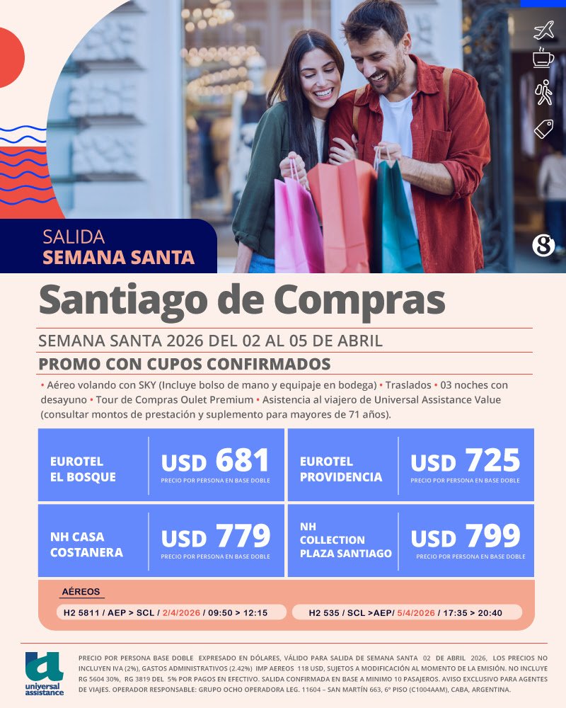 Vive una experiencia de compras inolvidable en Santiago de Chile durante la Semana Santa 2026 (del 02 al 05 de abril). Este paquete promocional con cupos confirmados incluye vuelo con SKY, equipaje de mano y bodega, traslados, y 3 noches de alojamiento con desayuno. Además, disfruta de un Tour de Compras en los outlets premium de la ciudad. La asistencia al viajero de Universal Assistance está incluida para tu tranquilidad, especialmente si eres mayor de 71 años.